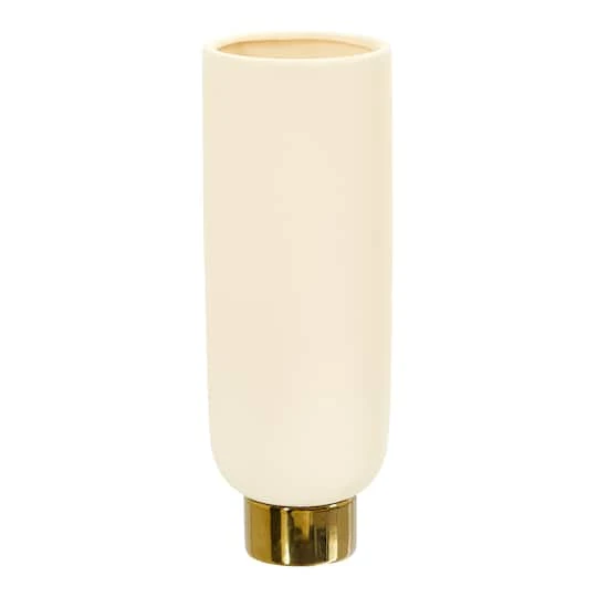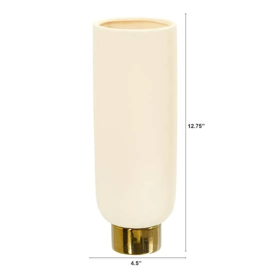 House your favorite flowers in this cream cylinder with gold base. Add an elegant, royal touch to your arrangement that complements modern, mid-century, contemporary and traditional home décors. Standing 12.75″ create your dream arrangement today and add a subtle yet trendy touch to your space.