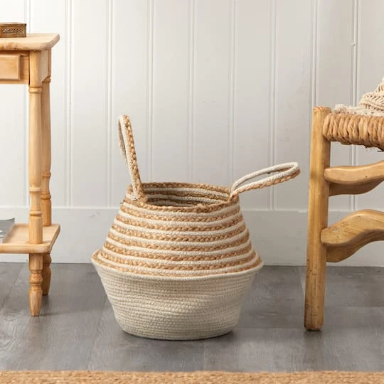 If you’re looking for a cute, trendy accent to house your favorite faux-bulous plant or a little extra storage, this jute and cotton basket is perfect. It is handmade by artisans for long-lasting use, and feels authentic and natural, especially if you enjoy an earthy palette. The lighter shade in the bottom provides a trendy touch enhancing its attractiveness. For easy storing, this basket has two handles on each side. Standing 11 inches, add this beautiful piece to any area in need of some texture and color. It features intricate details, such as woven trim, to offer a unique texture and a one-of-a-kind look. Use this basket to plant your own creations, or simply display it empty. As a planter, use for house pots with a width less than 13 inches. This item does not have drainage holes.