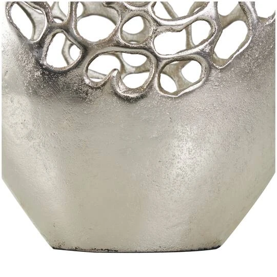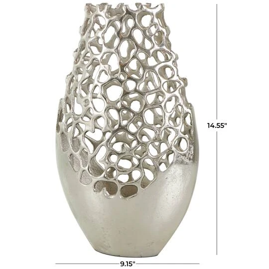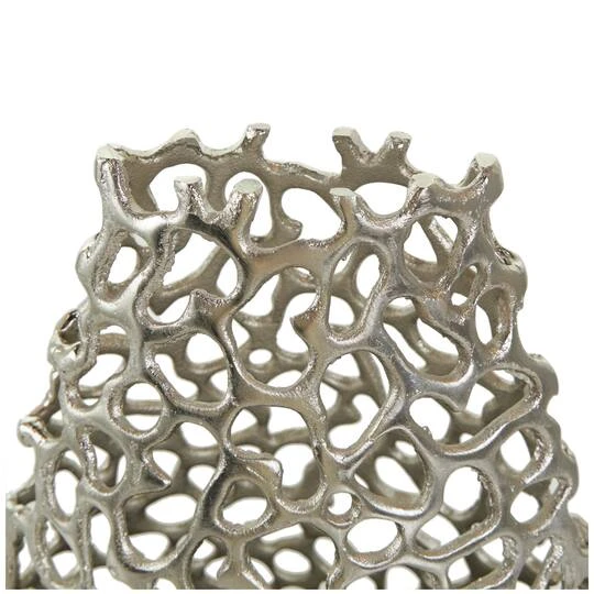 Crafted from lightweight yet durable aluminum material, with natural textured pock marks, this large silver vase will last for years to come. Stunning silver aluminum vase has an asymmetrical and freeform open lattice work design in a satin finish, making it a unique and eye-catching addition to any room.