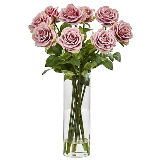 Full, romantic blossoms accented with just the right amount of foliage are bundled at the top of a clear cylinder vase with this rose arrangement. With its regal coloring, this 19-inch ornament will be a beautiful accent piece on your shelf, end table, or mantel. Complement it with orange, blue, or pink glass hurricane vases for a simple yet sophisticated finish.
