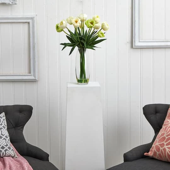 Stately and proud, this incredible tulip arrangement will be a focal point of your décor for years to come. A bevy of tulip stalks rest in a clear vase (complete with liquid illusion faux water), providing the perfect base for the delicate blooms above. Verdant leaves complete the picture, giving this tulip arrangement a distinct look that will stand the test of time. Perfect for home, office, or even makes a great gift.