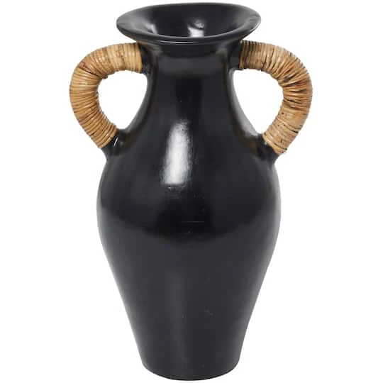 This handled vase is made of a solid terra cotta material and rattan wrapped accents. Modern amphora shaped decorative flower vase carries a matte black finish and rattan wrapped handles. Handles are hand wrapped in a light brown rattan enhancing the modern look of the vase.