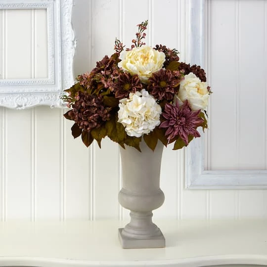Add elegant decadence to your space with this Peony, Dahlia and Hydrangea artificial arrangement. Clusters of ruffled textured petals, warm hues of leaves, and naturally occurring details, create an earthly like foliage. This fab palette makes a statement-without the guesswork or maintenance. Standing at 27″, this everlasting beauty welcomes you in a sand colored urn that complements many interior styles. Elevate your space today by adding in pairs to your home office, living room, or guestroom for symmetry. artificial arrangement will look beautiful for years to come; simply wipe clean with a soft dry cloth when needed.