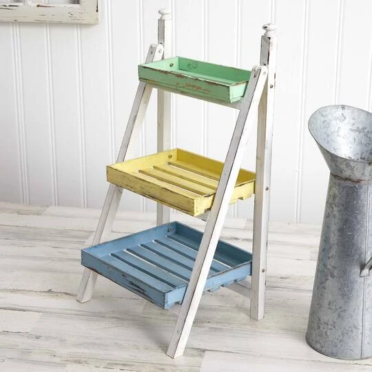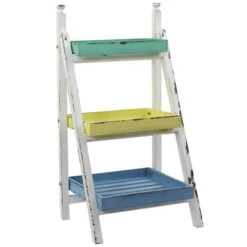 At a little over two feet tall, this decorative plant stand is perfect for any room. It has blue, yellow, and mint pastel shelves. The distressed finish pairs well with farmhouse and french country decor.