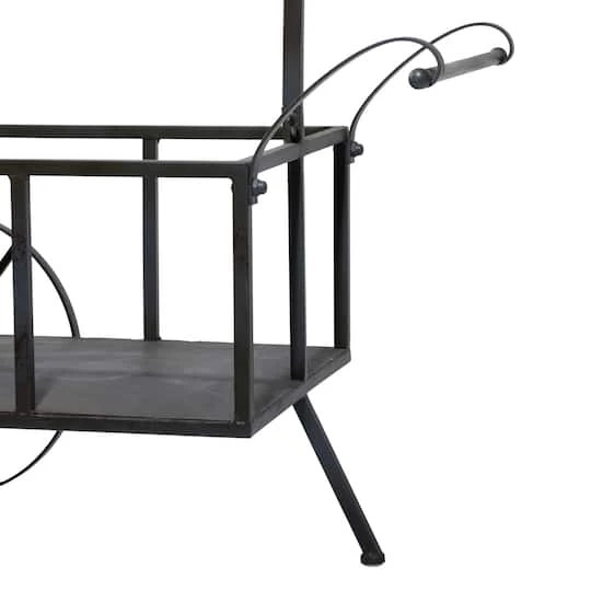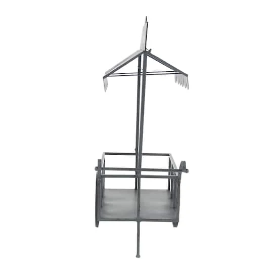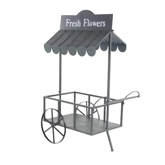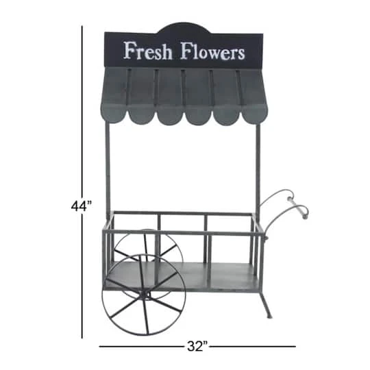 This Farmhouse style flower cart has adorable style, from its rolling canopy with a “FRESH FLOWERS” stencil to its large, old-fashioned wheels. Made from iron, this garden cart is lightweight and easy to pull from by large arched handle and sits upright on the metal kickstand to keep your potted plants in place. The rectangular planter box has iron bars to secure your pots but are spaced enough for beautiful display. The large, metal canopy keeps direct sunlight from harming your more sensitive perennials. This outdoor planter plant stand will bring a cozy feel to your garden area entryway or enjoy it in the backyard from your deck. This stunning trolley cart plantstand is ideal for outdoor usage and blends well with vintage and retro-themed furniture Wipe clean with a dry cloth. Lightweight & easy to pull. Suitable for indoor and outdoor use. Farmhouse-themed style Showcases a spray-painted “FRESH FLOWERS” text in white. This item comes shipped in one carton. Maximum weight limit is 5 lbs. per shelf.
