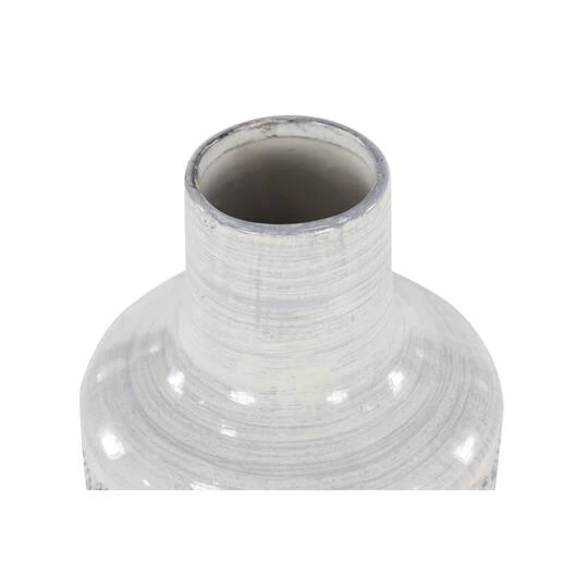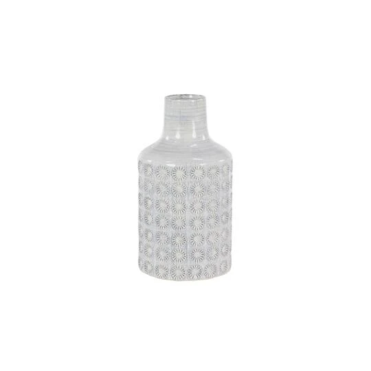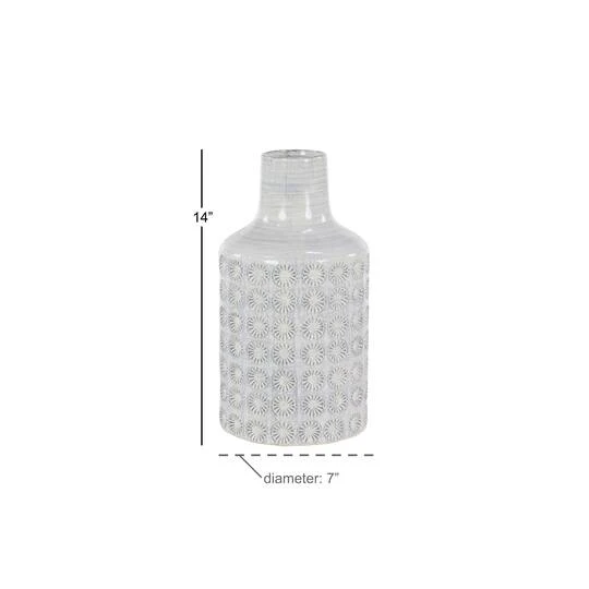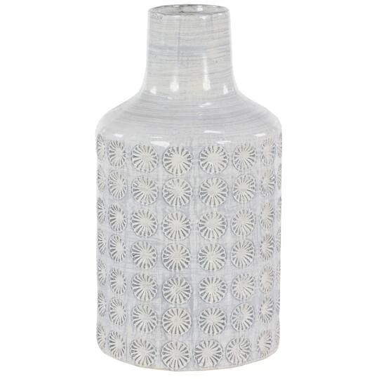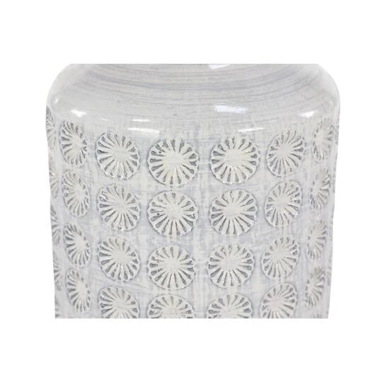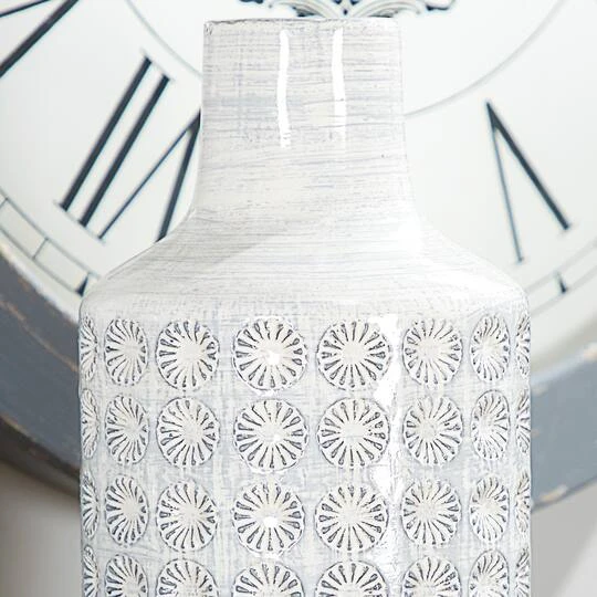 This tall ceramic vase boasts a high-gloss, glaze finish with a dusty light gray brushstroke accent on top for an eye-catching crosshatched texture. For even more depth and design, a lace-like rosette relief design is carved in rows throughout the entire cylindrical body. Designed with felt stoppers at the base that prevent scratching furniture and table tops, as well as sliding around.