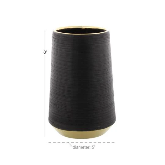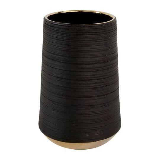 Step up your decor game with this glammed-out black and gold decorative vase, featuring juxtaposing textures and colors. The smooth, shiny, metallic gold rim stylishly contrasts the matte black ridged body with a pear shape that tapers into a 3” matte, natural-colored base. The interior is glazed with a mega-glossy black finish for a sleek look. Designed with black rubber stoppers at the base that prevent scratching furniture and table tops, as well as sliding around. This item ships in one carton. Suitable for indoor use only. Tapered cylinder vase with wide rim opening. Glam Design.