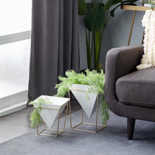 Leverage on the variation in pot depth and stand height, color, and smooth finish of this set of planters for contemporary or art deco designing. Such features can complement almost any color palette, pattern, and texture. The solid construction of both X-based stands and no-drainage hole pots are made of iron to add pizzazz to a corner of your living space. Planter heights are 10″ and 15″. Use as plant holders or corner accent pieces in art deco or contemporary interiors. Suitable for indoor and outdoor use. Made in India. Pots have no drainage holes. This set comes with 2 planters. Contemporary design. This item comes shipped in one carton.