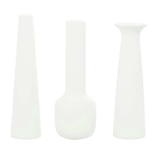 Use as a flower holder on your coffee, console, and kitchen tables, or as a decorative piece on a book shelf or office shelf. Displayed in your dining or living room, entryways or hallways, this vase is sure to bring charm and joy to any space. Enhance your table scape by displaying this set of ceramic vases on any accent table or mantel in your modern-themed entryway, lobby, living room, or kitchen. This item ships in one carton. Suitable for indoor use only. Each set comes with 3 decorative vases in varying sizes. Tall necks and round 2.18”, 1.75”, and 1.37” mouth openings. Modern Design.