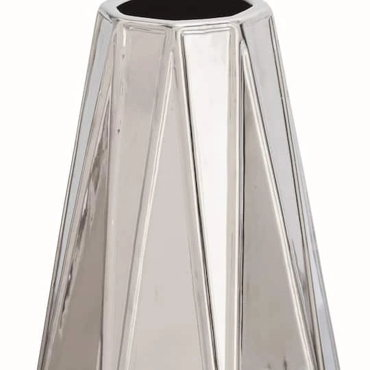 The medium-sized vases in this 3-piece set are made from stoneware. They feature an electroplated metal finish that leaves them looking like shiny silver molds. All have a smooth texture that is made more evident with the addition of angular geometric cuts. These flower vases works as flower holders, décor containers, and tabletop exhibits, offering both style and function to glam interiors. There are 3 staggered sizes included in this set, 1 tall cylinder vase, 1 large and 1 small gourd-shaped vase.
