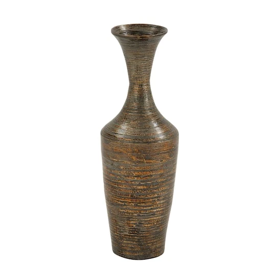 The timeless appeal of this brown lacquered bamboo vase will go well in your classy contemporary living space. It features a dark brown lacquered finish on bamboo, a wide rim, long neck, and a wide base. Its elegance lies from its base to the rim all in a traditional jar design. Place this on tables or floors and stir curiosity in your contemporary living space. Designed with black rubber stoppers at the base that prevent scratching furniture and table tops, as well as sliding around.