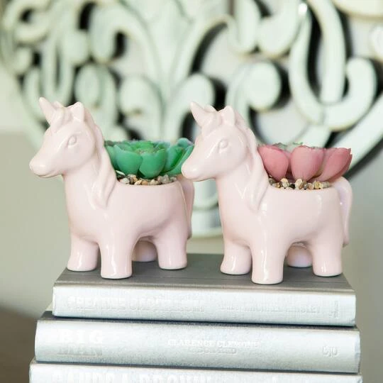 Decorate your home or office with the whimsical presence of our Pink Ceramic Unicorn Planter Set of Two. Hand-crafted by Artisans using superior ceramic material, these unicorn planters give a clean and chic feel to any tabletop, entry way, or window sill. Made of Ceramic and Pink paint, this indoor planter will add a bit of magic to your living space. The perfect planter for planting small succulents, and indoor house plants. There is no drainage hole, so no spill and no mess! We always strive to make your life easier so you that you can have more time for the important things in life. Buy a few at a time, so you can start a little Indoor Garden! Both adults and children go wild for these adorable and fun unicorn planters.