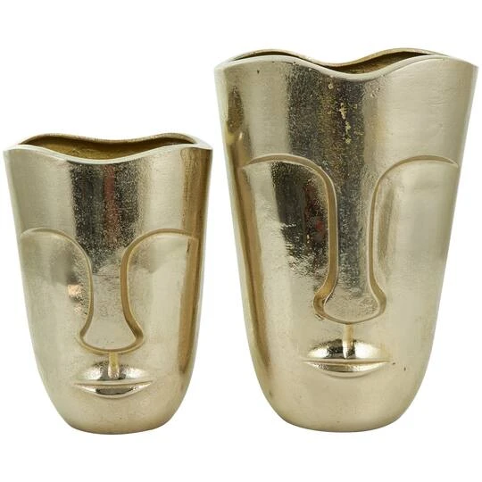 Indulge in the glamorous luxury of plush textures, dazzling details, and sleek finishes to elevate your home and add a sophisticated flair. Crafted from high-quality aluminum, these vases exhibit a durable material that ensures longevity and stability, making them reliable decorative pieces. The face vase set showcases a captivating gold color with a shiny finish, adding a touch of luxury and elegance to your décor. The set includes two vases of different heights, provide versatility and options for creating visually appealing floral arrangements or standalone accents. Style these vases as a pair on a dining table or use them individually as statement pieces in different areas of your home, elevating the aesthetic of your space. Designed with felt or rubber stoppers at the base that prevent scratching furniture and table tops, as well as sliding around.