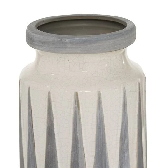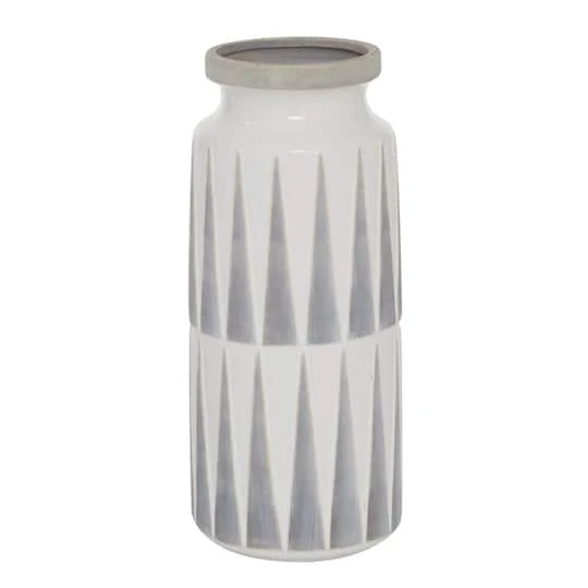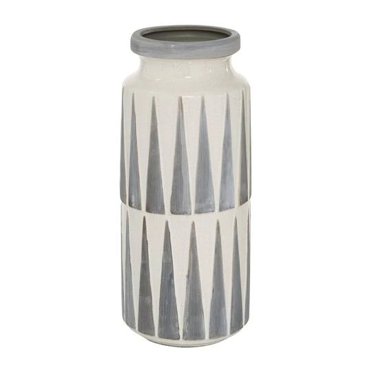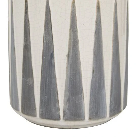 Bring modern textiles and tones to your tabletop with this stylish cylinder ceramic vase. The tall vase body features glossy white glaze with decorative crackling as a base tone, topped with two rows of tall, narrow harlequin-style triangle patterns with matte, dove gray finishes. The wide mouth has a rounded lip with a wide enough opening to display collected twigs, long-stem dried flowers, or other vase decor. The base has white stoppers to prevent scuffs and sliding, so you can confidently display this decorative vase on any surface. This item ships in one carton. Suitable for indoor use only. Tapered neck cylinder vase with medium-sized rim opening. Traditional theme.