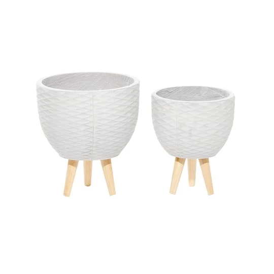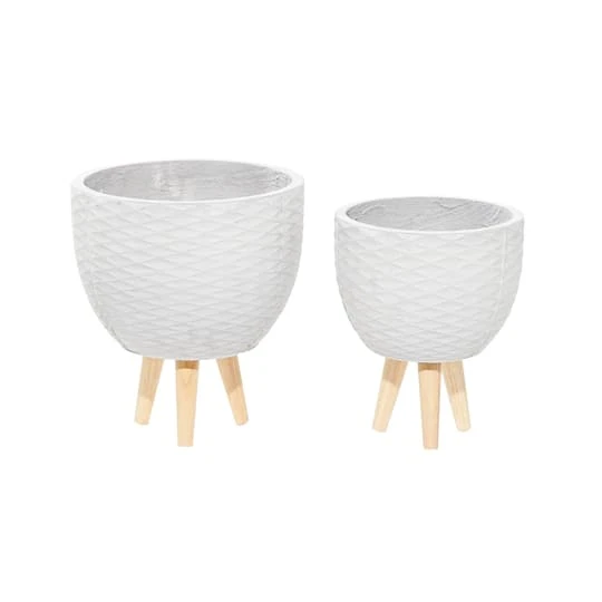 Leverage on the variation in pot size, stand height, color, and ceramic-like finish of this 2-in-1 set of indoor planters for modern and contemporary interior designing. Such features can complement almost any color palette, pattern, and texture. Both the solid construction of rubberwood stands and no-drainage hole pots made of fiber clay add pizzazz to a corner of your living space. Use them as pots or as accent pieces.