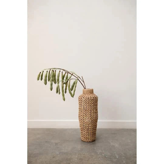 Perfect for the waterfront home, this 30 inch high water hyacinth vase is a beautiful addition to a tropical décor. Place a few dried or artificial tall botanicals inside and display near a woven basket full of colorful woven rattan spheres. To add an extra touch of color, place on a brightly colored round rug.