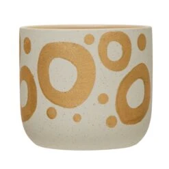 This charismatic, modish hand-painted stoneware planter has a fun circular metallic gold design. A stylish planter will add a classy touch to any bedroom, kitchen, living room, or office.
