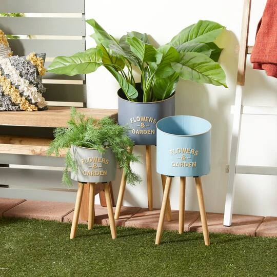 Add this charming Multicolored Metal & Wood Farmhouse Planter Set in your bohemian inspired living space and see what colors can do to your home or garden design. These metal and wood planters feature a tin can design planter which are raised by a tripod wooden leg design. The planter body comes in a cylindrical can design with pastel hues, while the legs come in round wooden poles with a light brown color. This trio will look good together in any room of your boho inspired house or outdoor space.