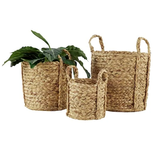 Whether your décor style is traditional or boho, this set of 3 versatile round seagrass basket planters brings natural texture and earthy hues to your garden or living room! Handwoven in Vietnam using water hyacinth dried in the sun into sturdy wicker, these planter baskets feature natural wheat beige and light brown hues throughout the thick braided strands. Display your plants beautifully indoors or outside!