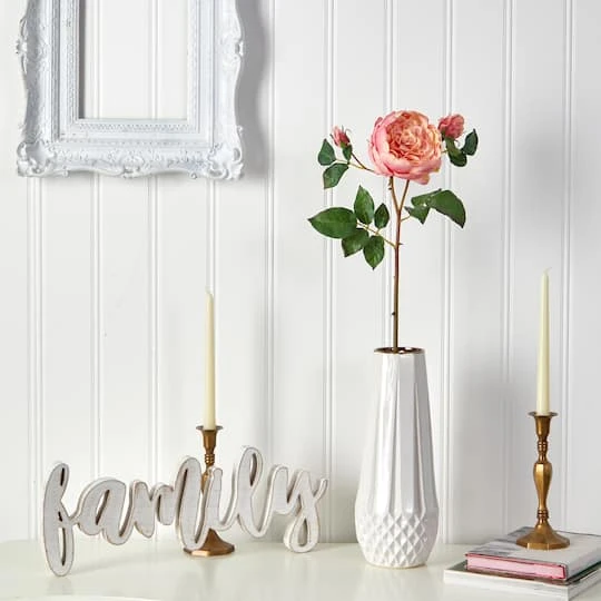 Create your own beautiful arrangement with this set of artificial rose flowers boasting gorgeous, intricate blossoms, frozen in mid-bloom. Handsomely complemented with realistic leaves and budding floral, this set of six, 22″ stems will instantly create feminine elegance wherever displayed.