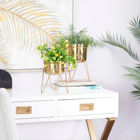 Display these elevated metal planters with stands near tall glass windows and white toned walls to achieve the perfect modern minimalist vibe A smart chic style inspired living space knows how important mixing and matching is, especially when it comes to adding some greenery in your space. A sturdy and long lasting construction that for a long lasting display. This item is shipped in one carton. Made in India. These metal planters have no drainage holes. These planters come as a set of 2. Modern style. Suitable for indoor use.