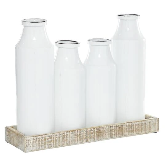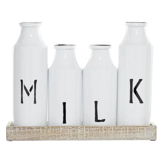 This farmhouse style inspired White Iron Farmhouse Decorative Milk Bottles Set features 4 milk bottles each with a letter of the word “MILK” coupled with a wooden tray. This home décor is perfect for creating a focal point over your accent table, countertop, shelf, or mantel. Various stays milk bottle stands securely on a rectangle tray for easy hold and transport. Designed with black rubber stoppers at the base that prevent scratching furniture and table tops, as well as sliding around.