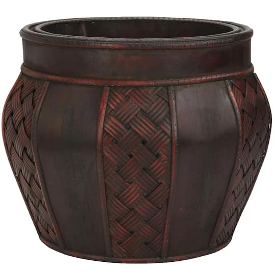 This two-vase collection comes in different sizes for decorating ease. Place your different sized blossoming arrangements or plants to complement the beauty or just enjoy them on their own anywhere (they’re that pretty). Each vase comes with a dark wine reddish brown finish with enough variation to give it a unique look. Segmented trim separates the tropic inspired cross thatching and smooth leathery looking dark brown background.