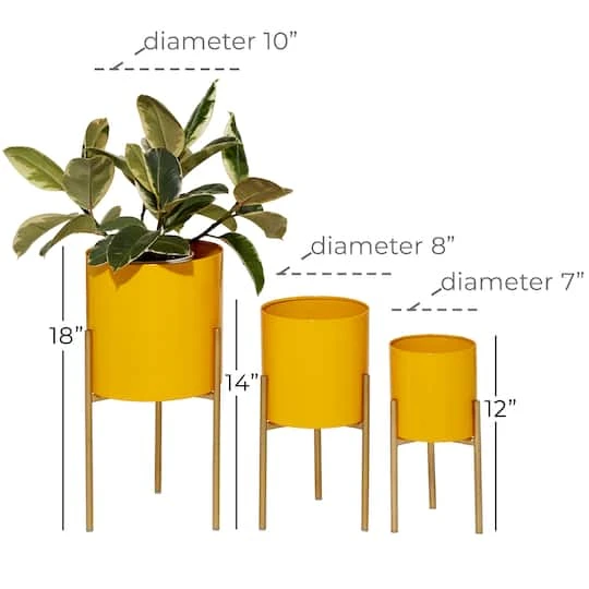 Leverage on the variation in pot depth and stand height of this Yellow Metal Contemporary Planter Set for contemporary interior designing. The brightness of its color can complement lively color palettes, bold patterns, and tactile textures. The solid construction of both X-shaped stands and pots are made of iron to add vibrancy to a corner of your living space. Use as plant holders or corner accent pieces in retro or bohemian-themed interiors.